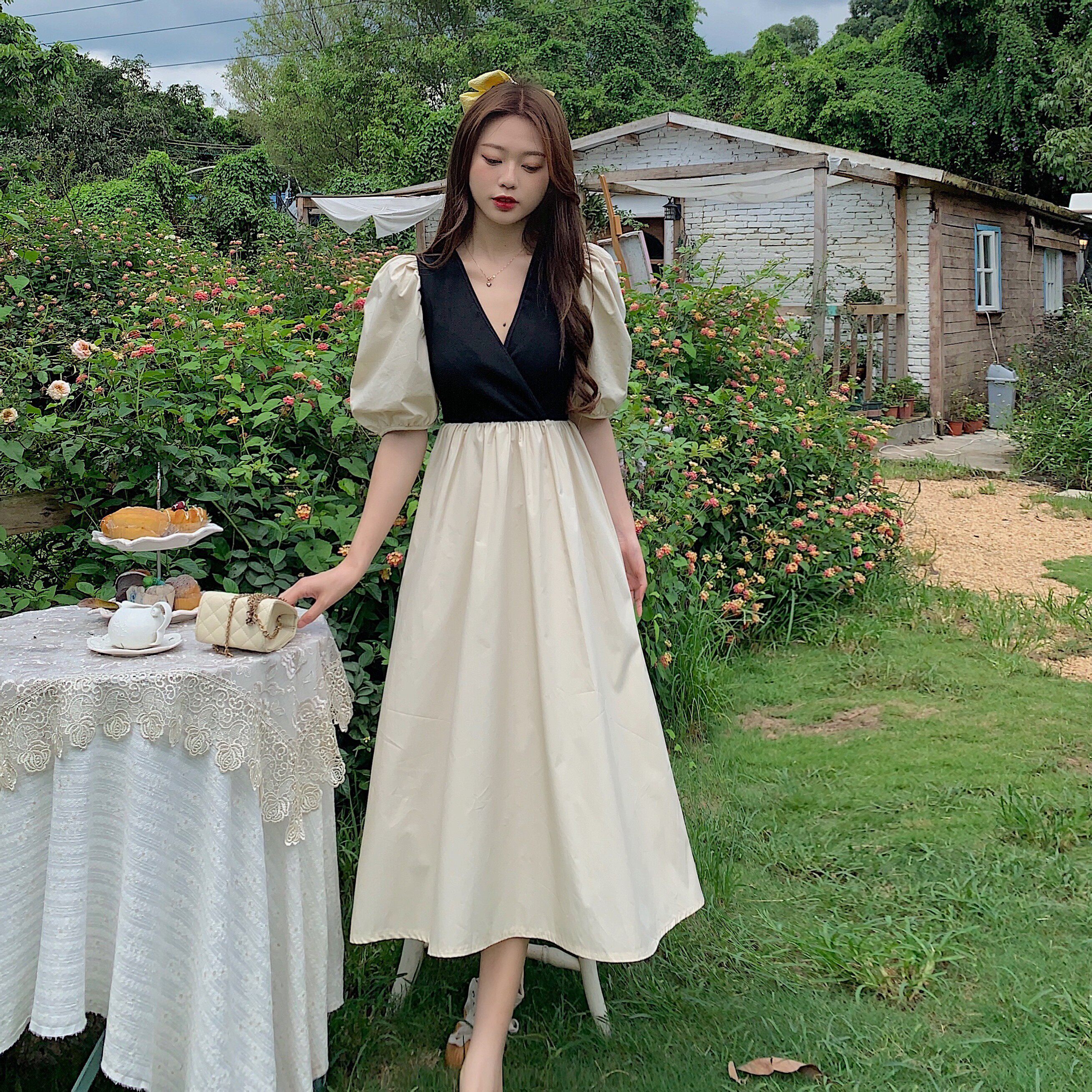 实拍实价~新款韩版设计感撞色拼接假两件系带收腰中长款连衣裙热门设计联盟服务商