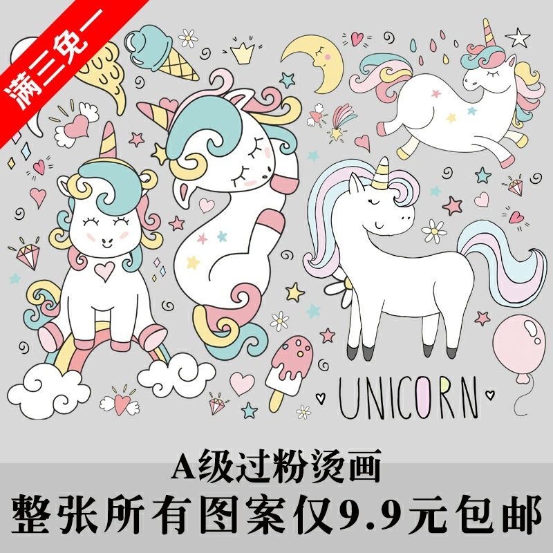 烫画贴卡通独角兽冰激凌星空气球A级过粉热转印衣服印花柯式热门设计联盟服务商